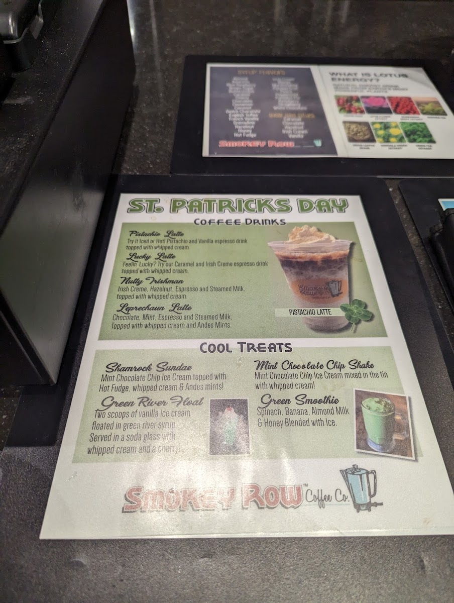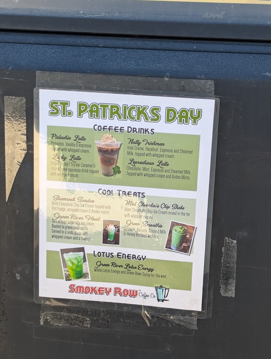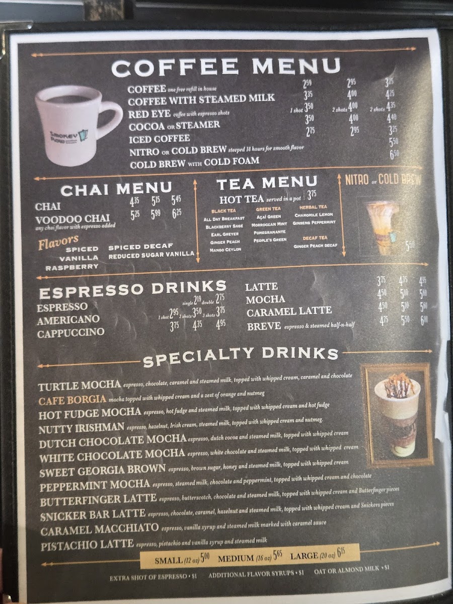 The coffee and drinks menu caters to a variety of tastes, from traditional hot coffee and iced lattes to unique flavors like the Butterfinger Mocha or Sugar Free Vanilla Chai Latte. Refreshing choices like Green River Soda or Nitro Cold Brew offer an inviting alternative on warmer days or when you need an extra caffeine kick.
